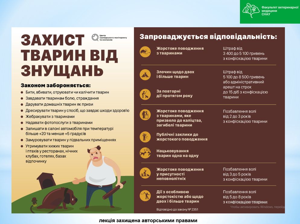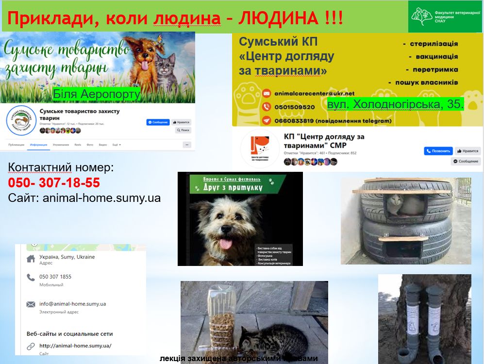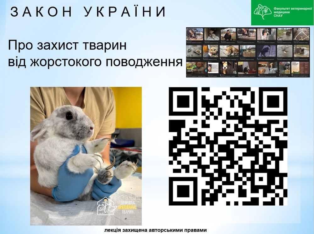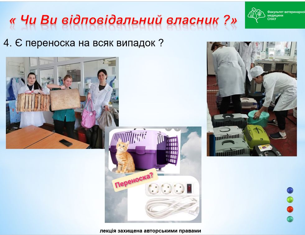 Було озвучені питання відповідального ставлення до тварин, закону України щодо жорсткого поводження з тваринами, запропонована схема оцінки їх здоров’я, щеплення, догляду, годівлі, карантинні обмеження.