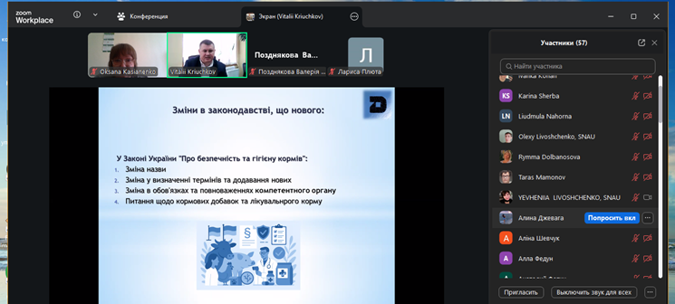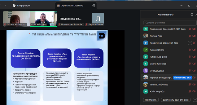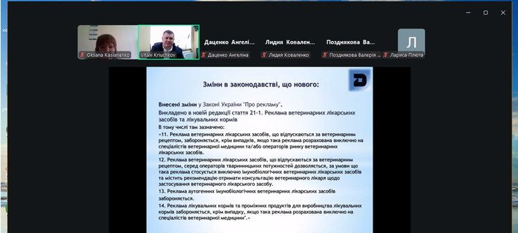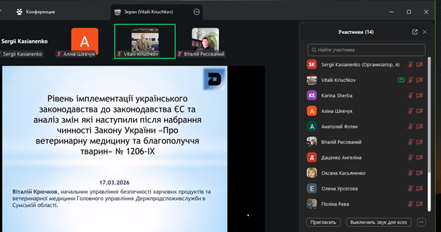 17 березня на факультеті ветеринарної медицини для здобувачів ОС “Магістр” та ОС “Доктор філософії” проведена гостьова лекція на актуальну тему: «Рівень імплементації українського законодавства до законодавства ЄС та аналіз змін, які наступили після набрання чинності Закону України «Про ветеринарну медицину та благополуччя тварин» № 1206-IX».