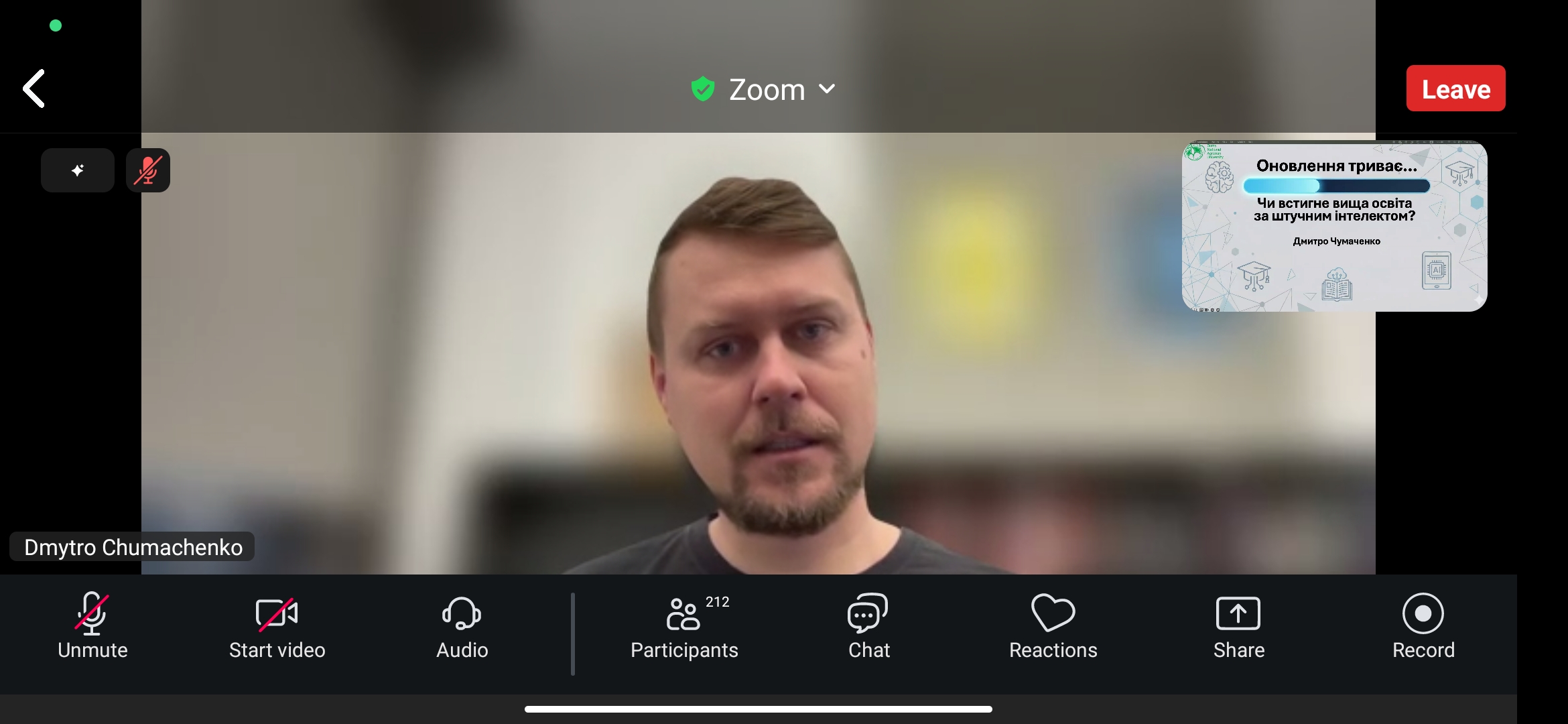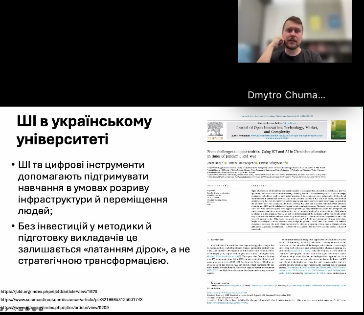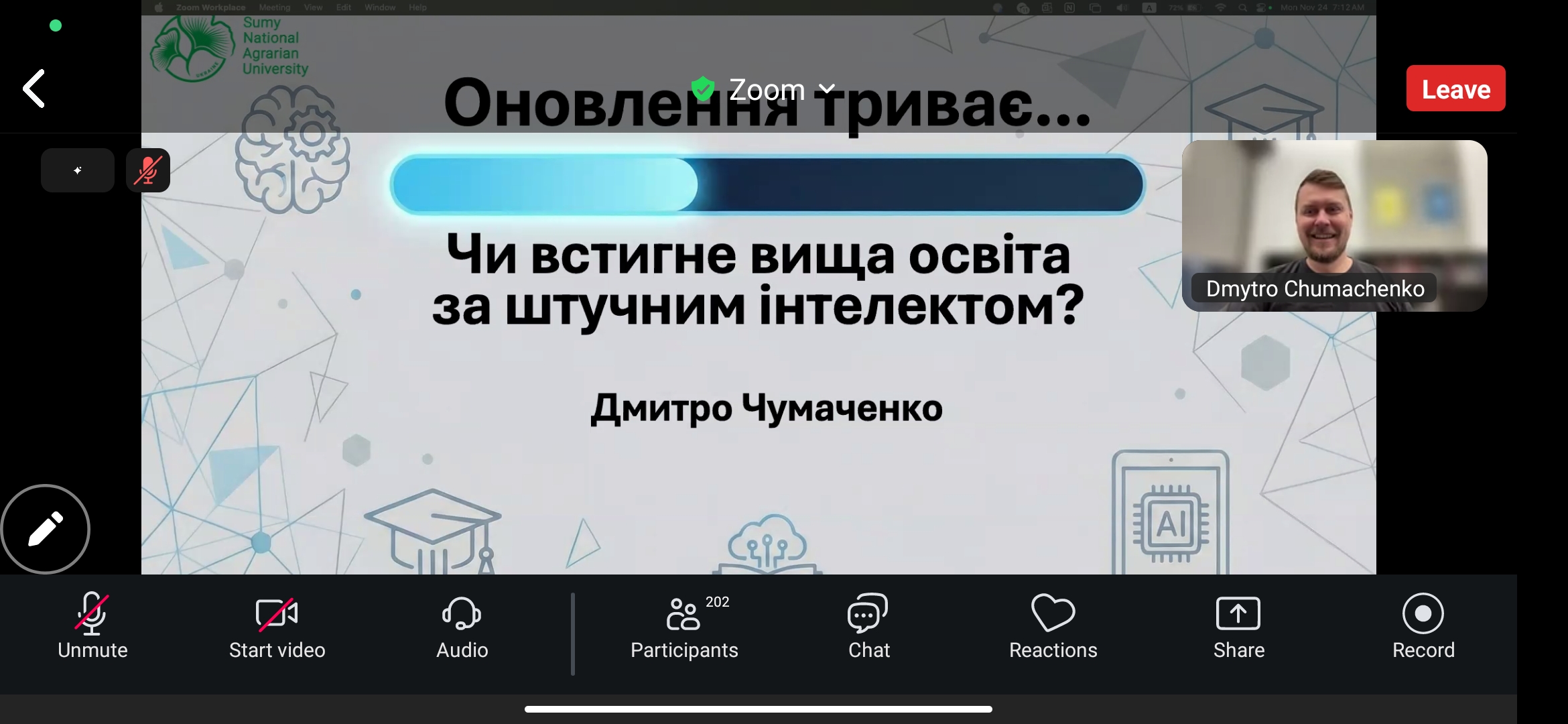 24 листопада 2025 року в межах Тижня академічної доброчесності в Сумському НАУ відбулася відкрита онлайн-доповідь Дмитра Чумаченка на тему: «Оновлення триває… Чи встигне вища освіта за штучним інтелектом?»