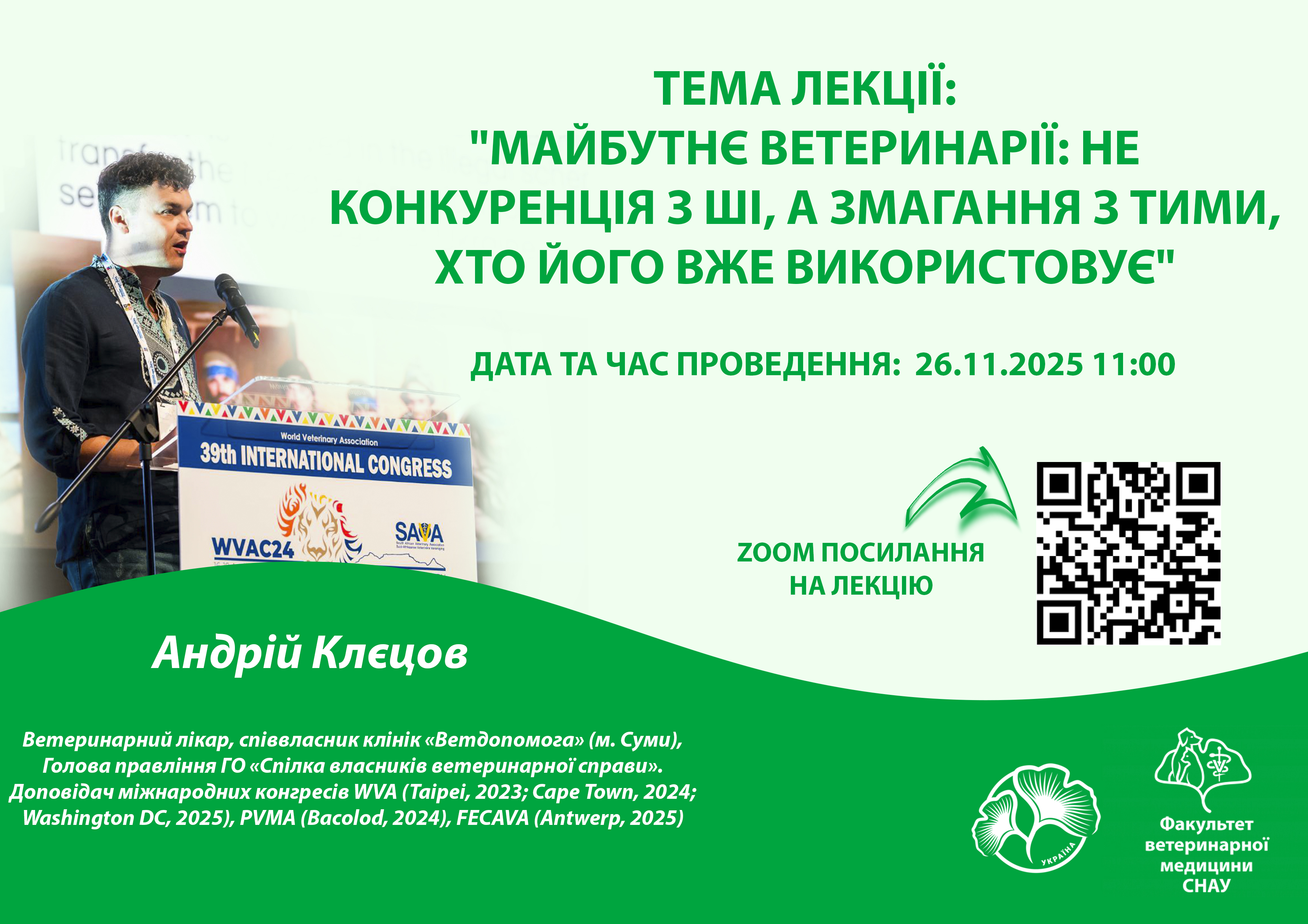 Запрошуємо всіх студентів та науковців факультету ветеринарної медицини СНАУ на надзвичайно актуальну лекцію Андрія Клєцова, присвячену майбутньому ветеринарії в епоху штучного інтелекту.