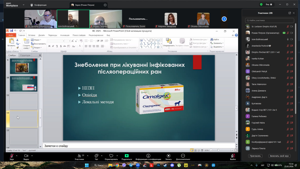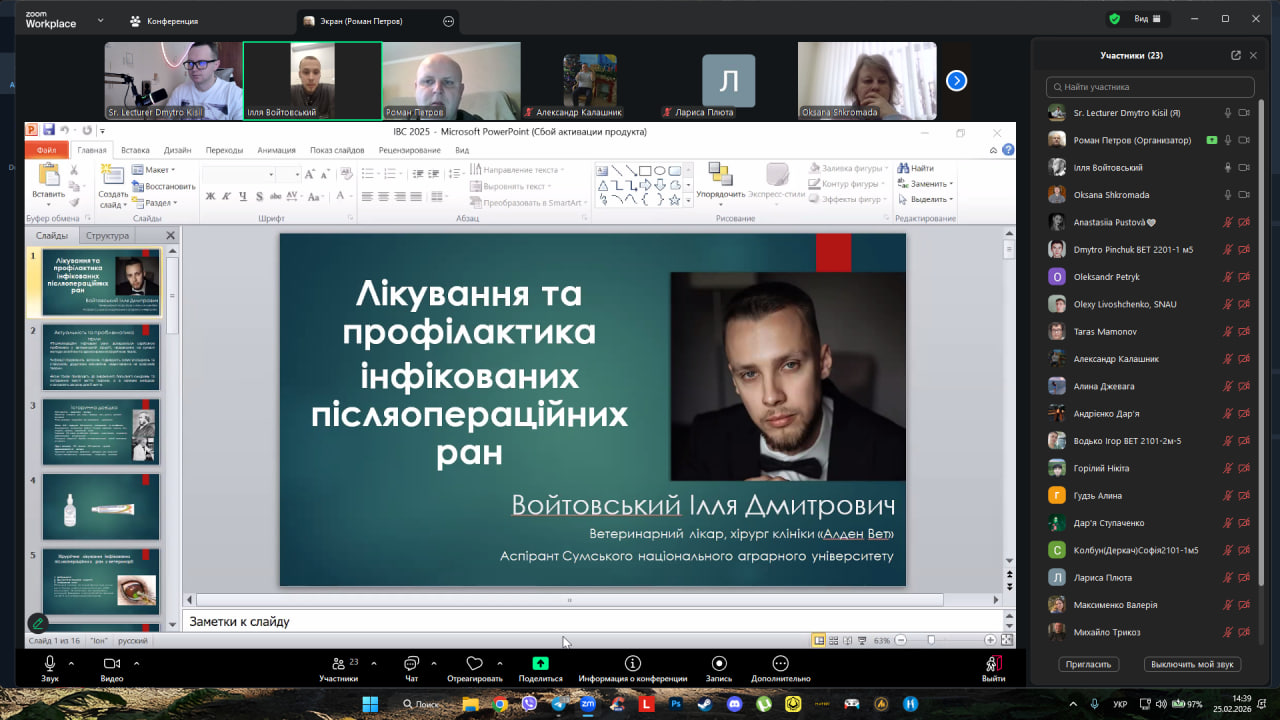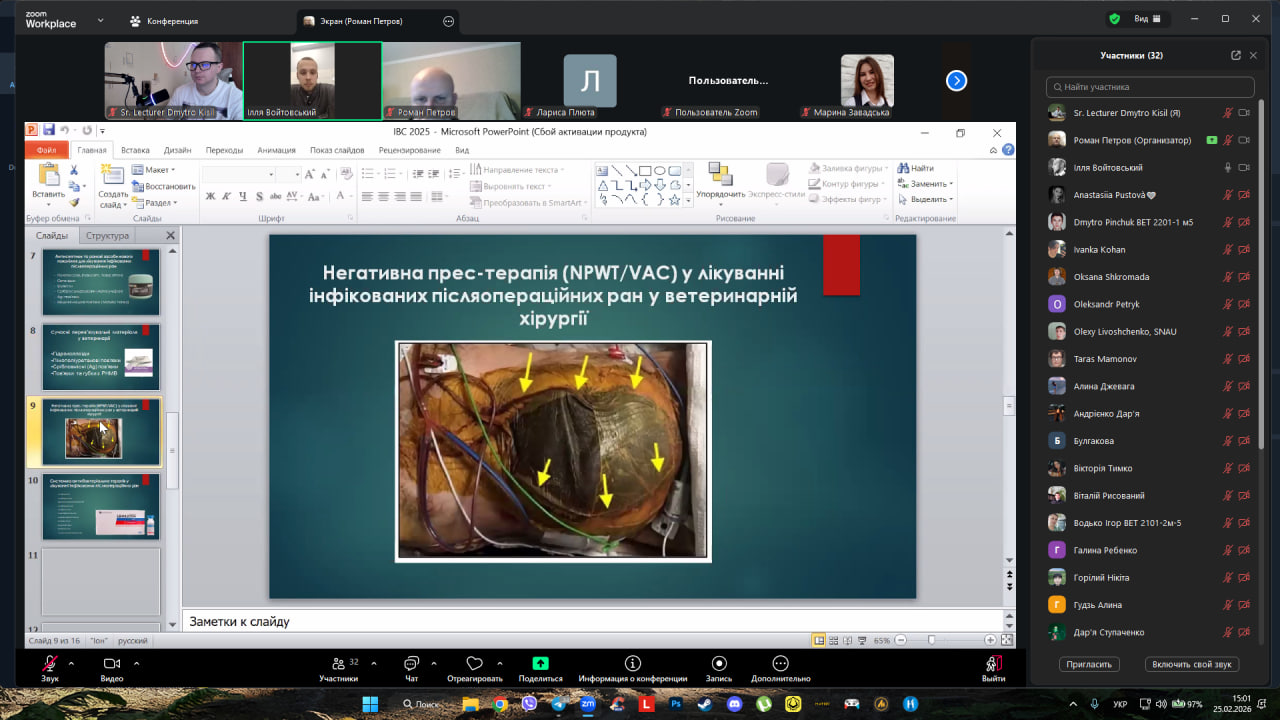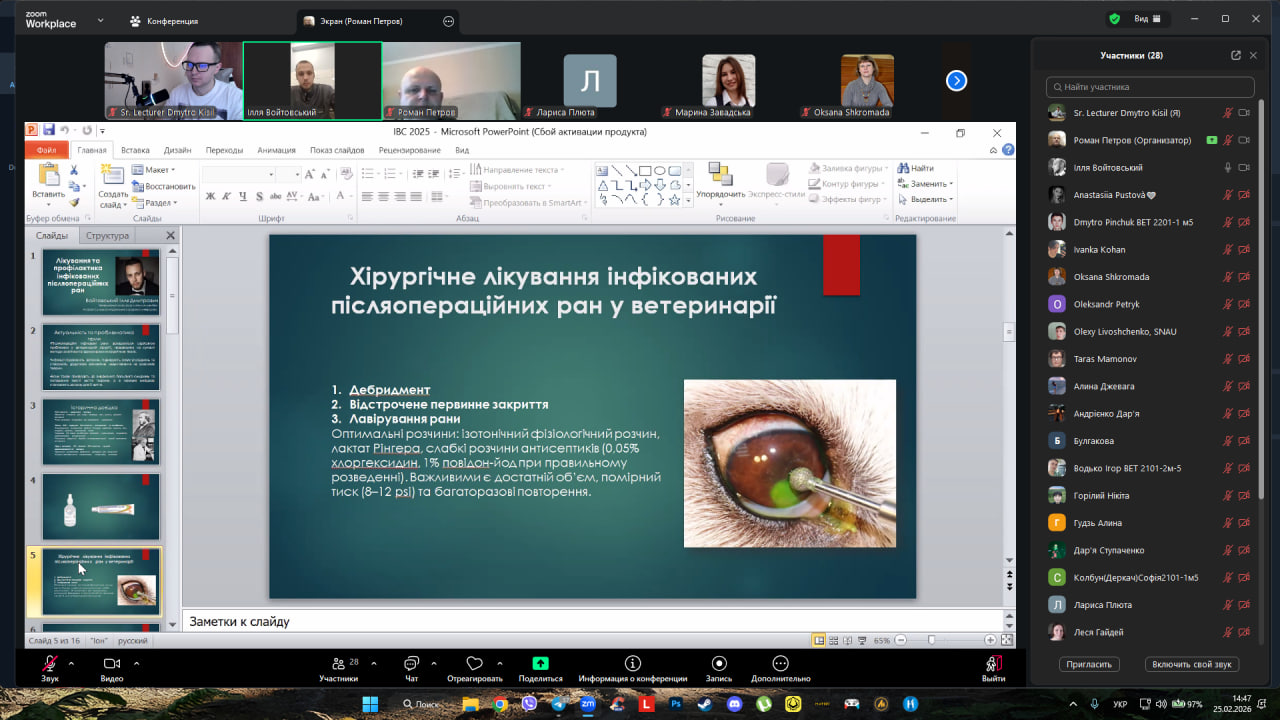 Під час заняття було ґрунтовно розглянуто сучасні підходи до профілактики ранової інфекції, алгоритми діагностики та лікування інфікованих ран, а також висвітлено практичні аспекти хірургічного втручання у дрібних домашніх тварин. Особливу увагу приділено доказовим підходам у ветеринарній медицині та аналізу клінічних випадків із практики.
