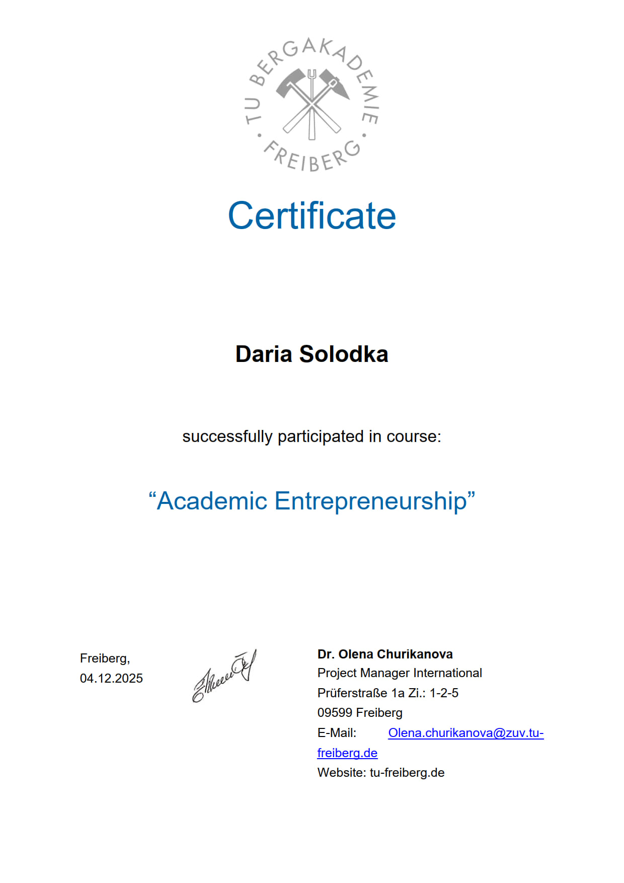 Здобувачка ОС «Доктор філософії» факультету ветеринарної медицини СОЛОДКА Дар’я успішно завершила онлайн-курс навчання Academic Entrepreneurship на ресурсному порталі німецького Технологічного університету Bergakademie Freiburg (TU Bergakademie Freiberg – TUBAF) SUUUpoRT, мета якого полягає у структурній підтримці української системи вищої освіти. Дар’я мала змогу отримати нові знання в царині академічного підприємництва та розглянути можливості подальшої комерціалізації результатів власних досліджень. Основна увага в даному курсі була зосереджена на трансформації отриманих здобувачкою академічних знань, результатів досліджень та інновацій на конкурентоспроможні підприємницькі проєкти. Дар’я не лише розширила власне підприємницьке мислення, але й опанувала інструменти лідерства та управління в підприємницькому контексті для сприяння нетворкінгу, побудові партнерських відносин та використанню університетських ресурсів для успіху підприємництва.