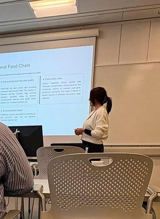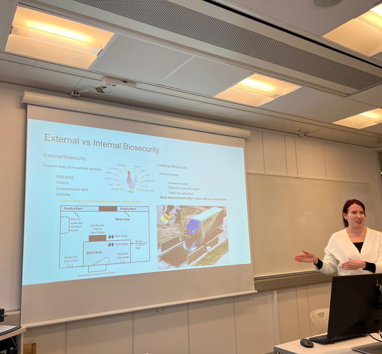 Під час лекції було висвітлено актуальні питання сучасного птахівництва, зокрема фактори, що визначають якість м’яса птиці, підходи системи «farm-to-fork» у забезпеченні безпечності харчових продуктів, ключові харчові патогени, а також аспекти здоров’я та благополуччя тварин і біобезпеки у виробничих умовах.